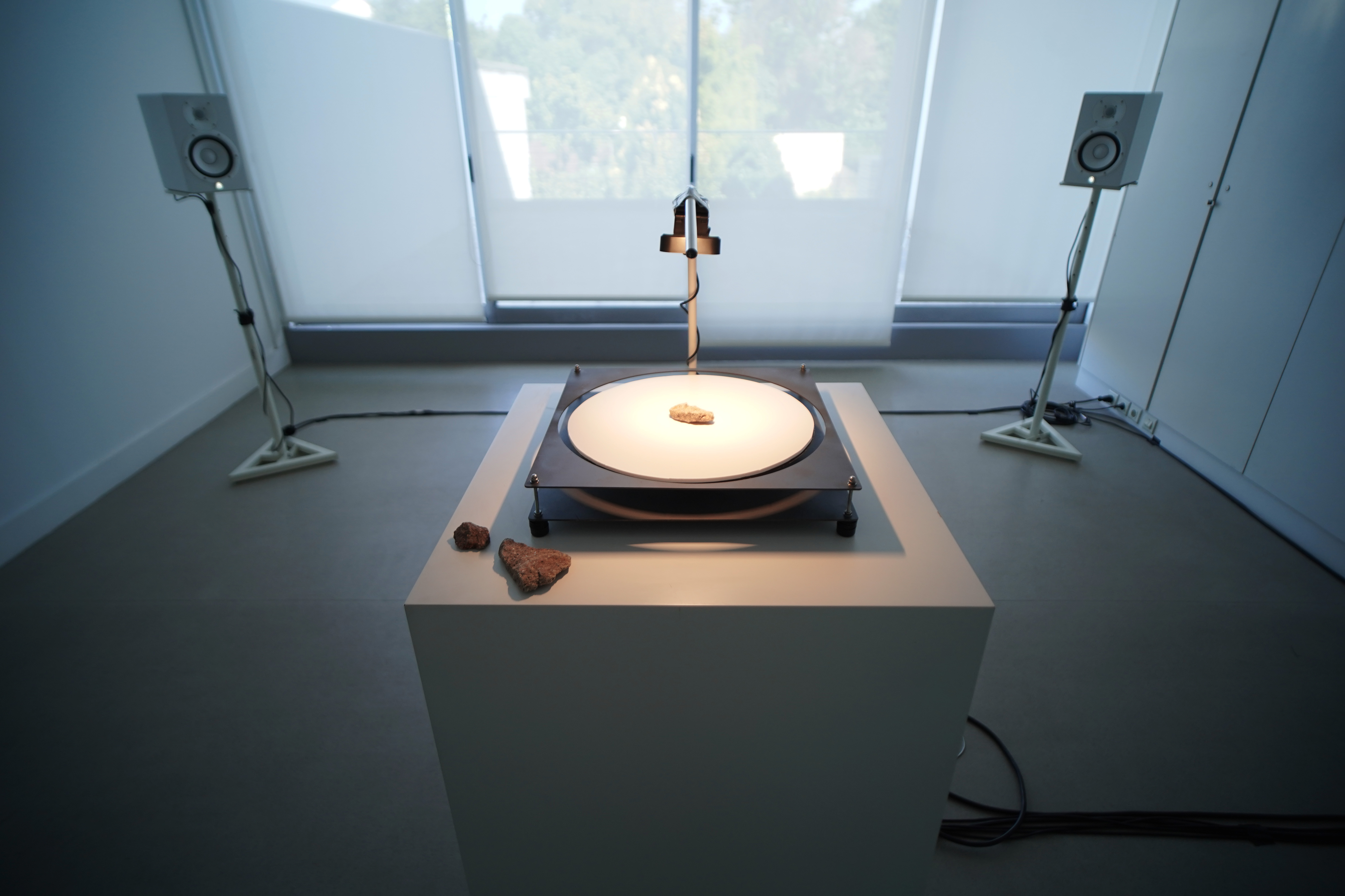 How can we establish contact with non-human entities through technology, and what are the consequences of this relationship? This installation by Teresa Castro and Miguel Loureiro speculates on listening to a place through its geomorphology, proposing a remix of the soundscape and visual landscape by monitoring real-time values assigned to the contours of rocks collected at Castro de São Paio. It invites the observation of stones (and objects) as part of their creation process, thus speculating a lithic narrative that generates new meanings translated through technology.