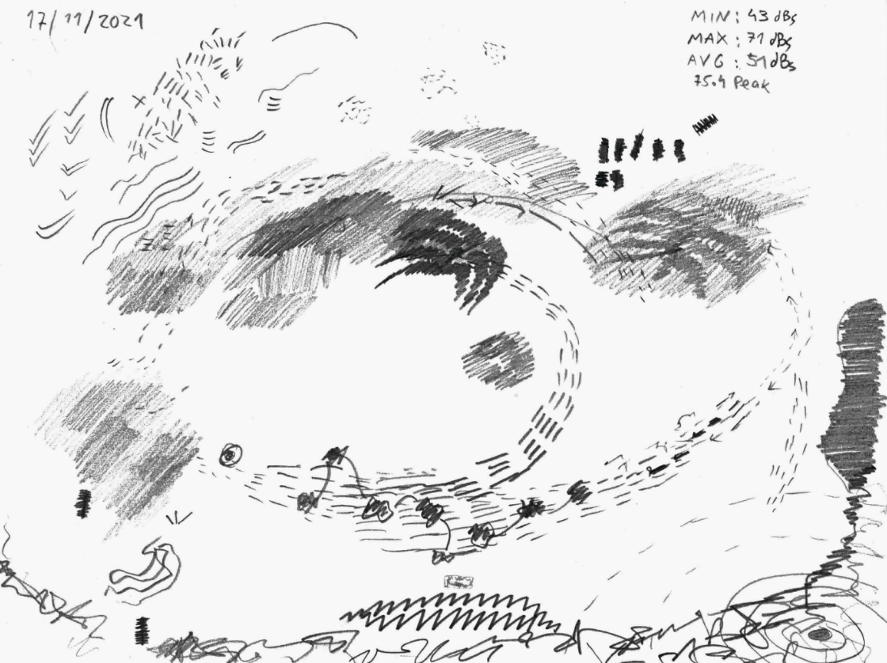 Automatized through computation, the values in dBs of the noise in the garden are randomly enumerated to the performer and it’s up to his/ her artistic direction to interpret this numeric information through body expression. Also through computation, the location and movement of the performer are tracked, saved and drawn, creating an alternative noise map.
